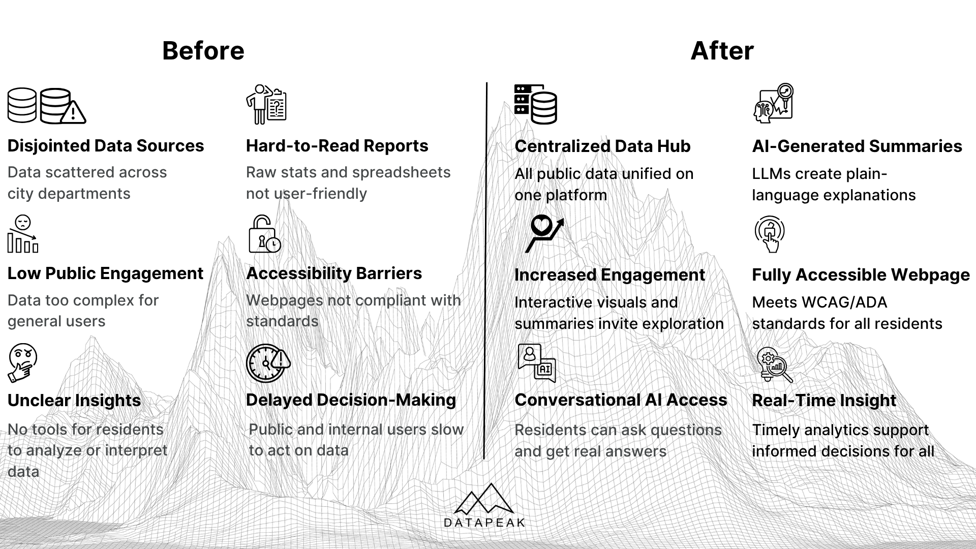 By implementing DataPeak, the city made its data truly accessible. The platform used AI and large language models (LLMs) to analyze thousands of rows, summarize key insights in plain language, and published them on an accessible, user-friendly webpage.